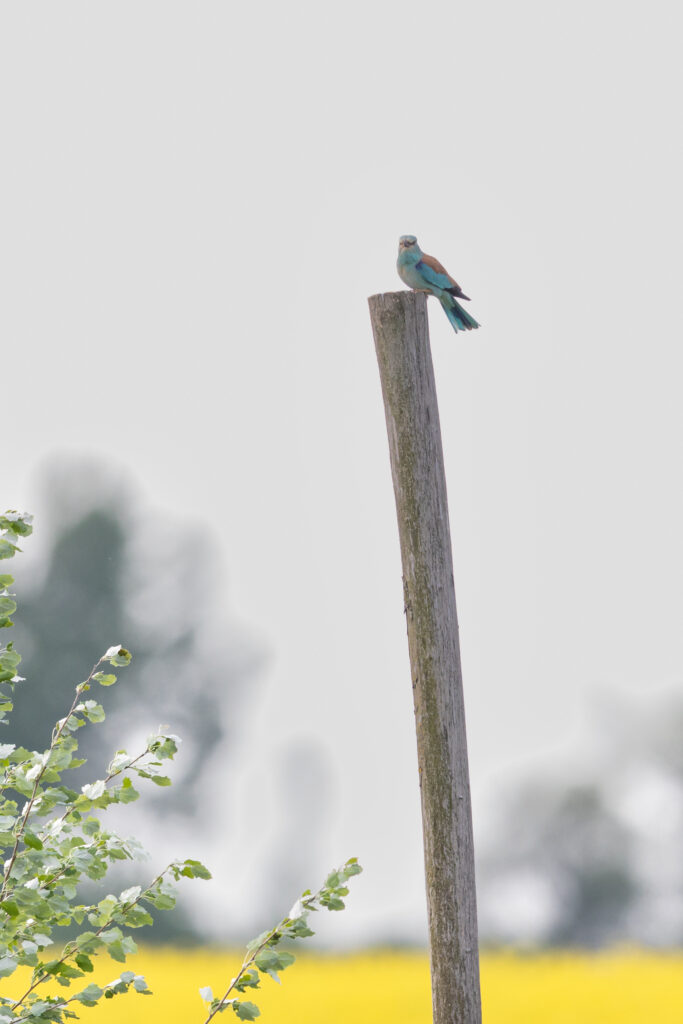 În timp ce unele exemplare încă își parcurg lunga călătorie, există dumbrăvence care au ajuns deja înapoi pe teritoriile lor de cuibărit. Un astfel de exemplar a fost surprins de colegul nostru, Nagy Attila, în timp ce evalua terenul lângă un cuib artificial nou instalat.